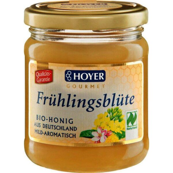 HOYER Frühlingsblüte Bio-Honig zeichnet sich durch seinen milden, blumigen Geschmack und seine helle, goldene Farbe aus. Er erinnert an sonnige Frühlingswiesen und den Duft blühender Bäume. Dieser Honig ist ein wahrer Genuss für die Sinne und verfeinert jedes Gericht.